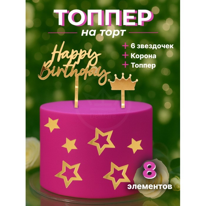 Топпер зеркальный Happy birthday (Корона/палочка 1 шт, Звезда 3 шт), золото 266157